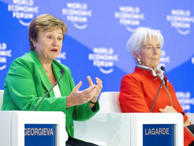 International capitalist institutions are closely connected. Current IMF head Kristalina Georgieva at the World Economic Forum in Switzerland, January 2025. Alongside is her predecessor Christine Lagarde, now European Central Bank president. Photo World Economic Forum / Thibaut Bouvier via Flickr (CC BY-NC-SA 2.0).